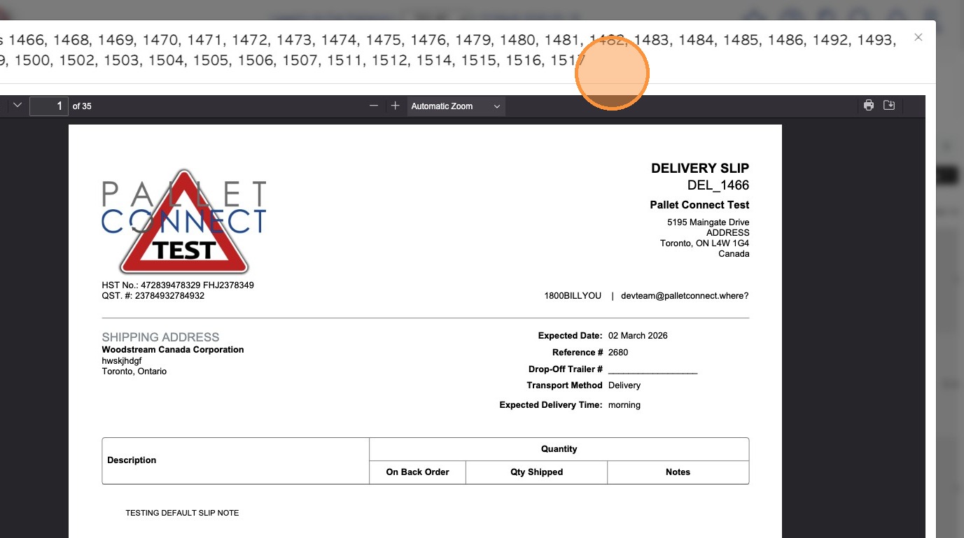 9. The delivery slips will be generated in PDF form and can be downloaded. The document numbers will be listed at the top.