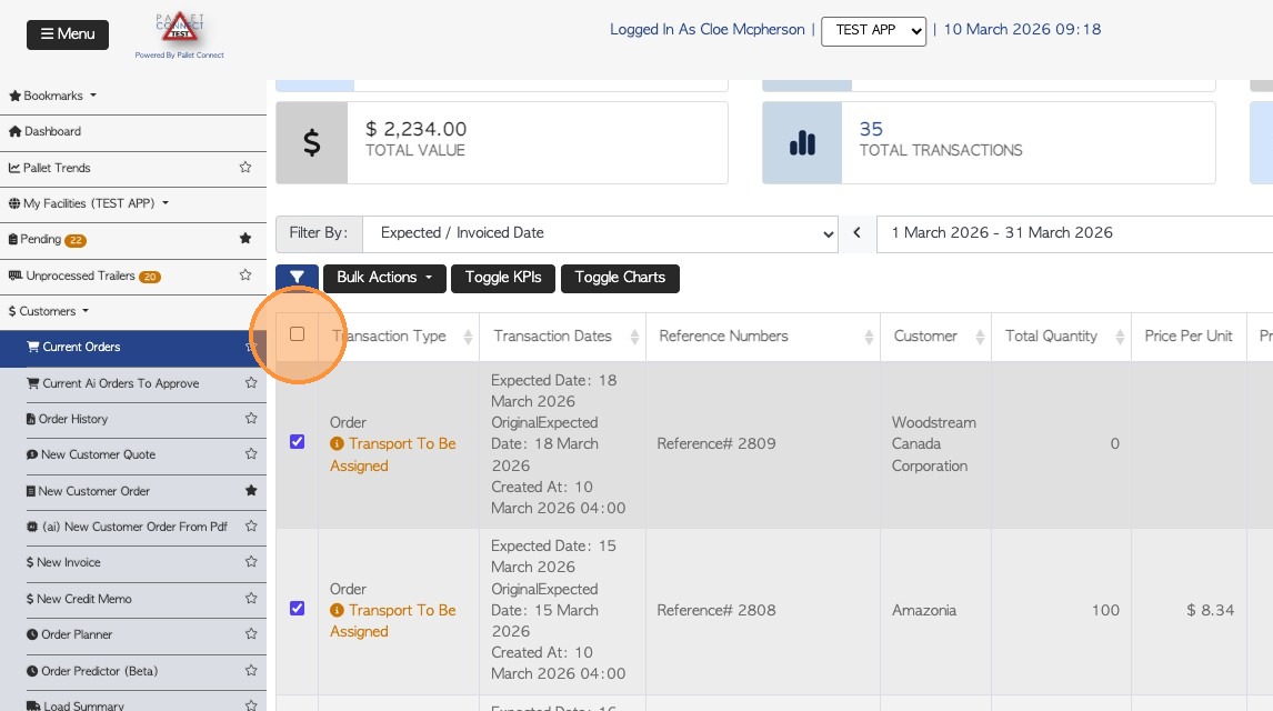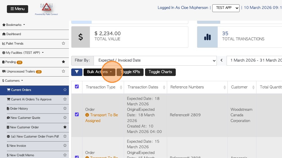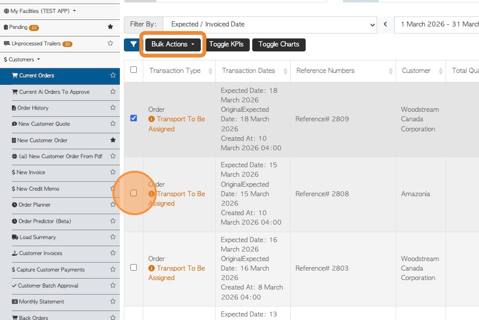 5. Once one of these checkboxes is selected, a "Bulk Actions" button will appear. Select the relevant orders using the checkboxes on the side.