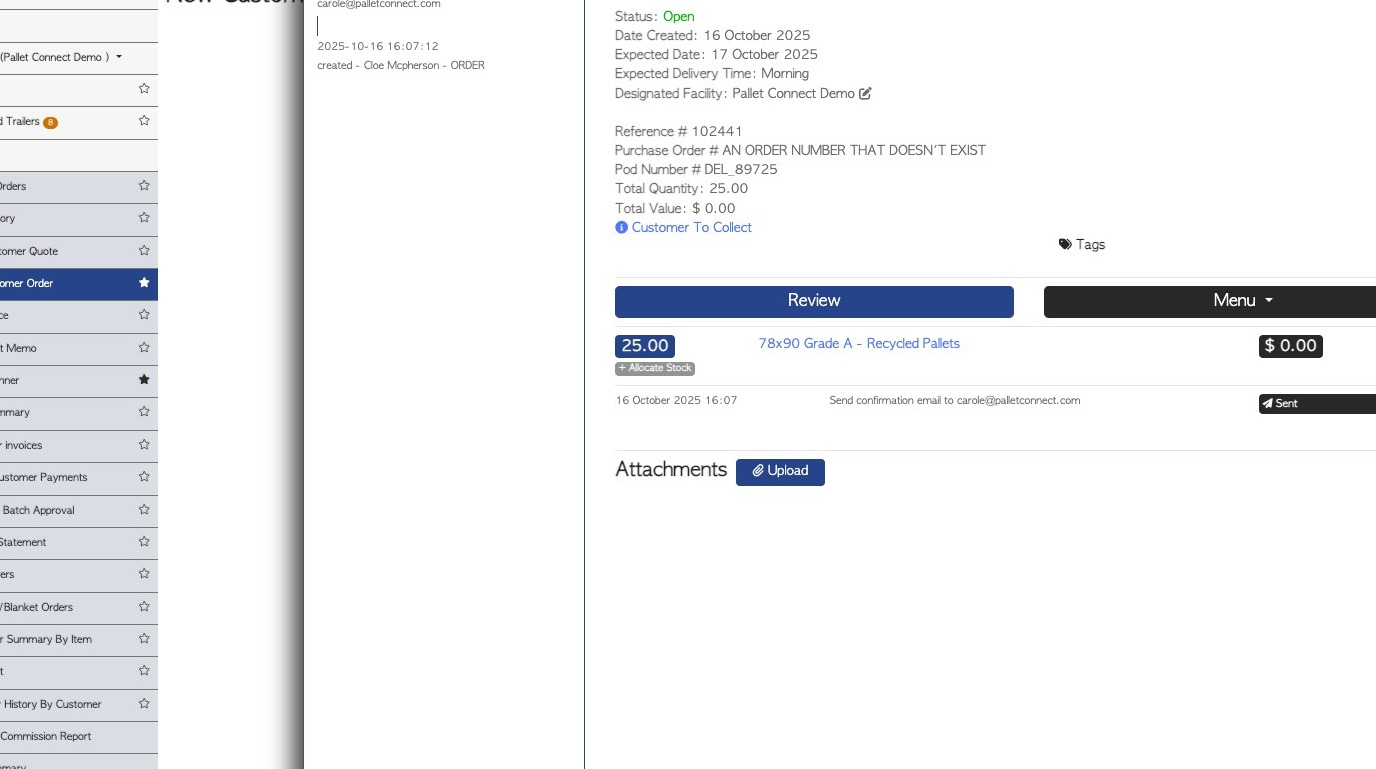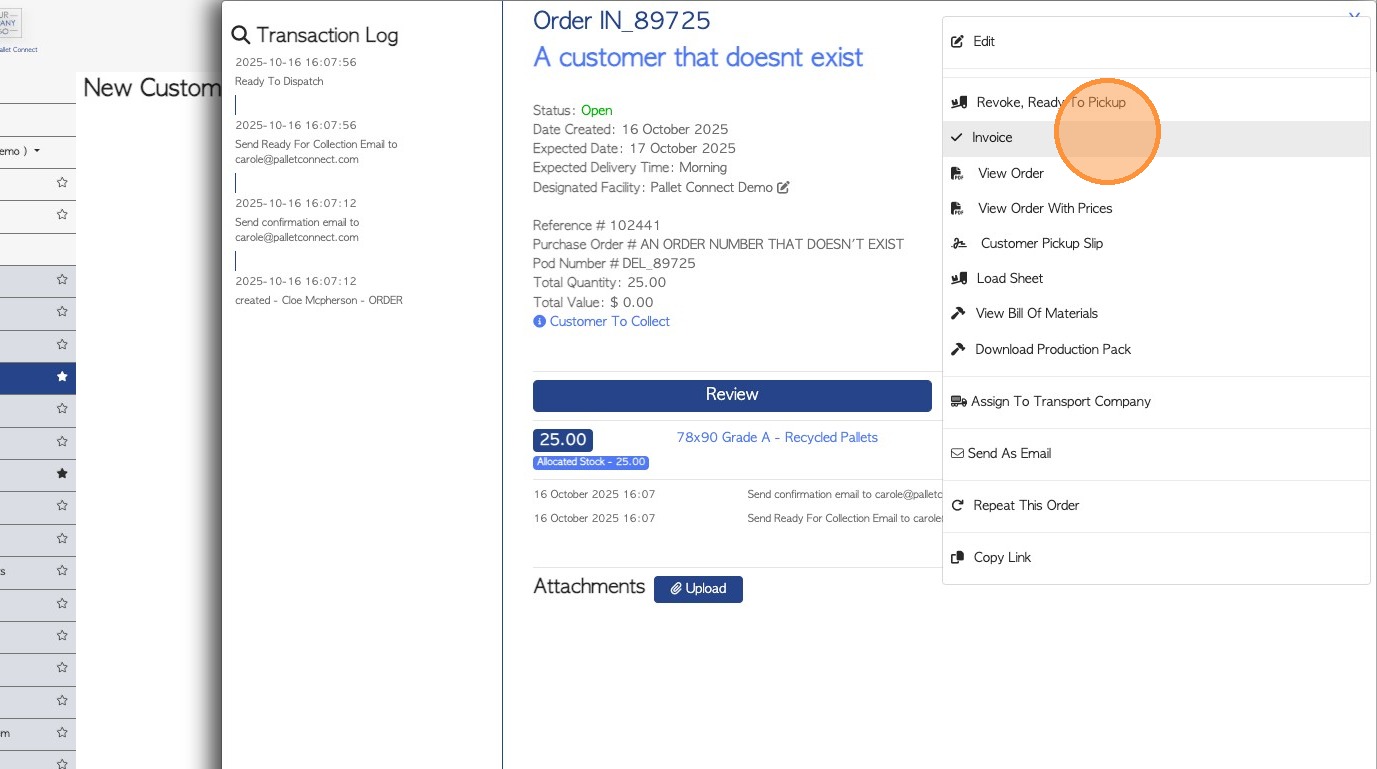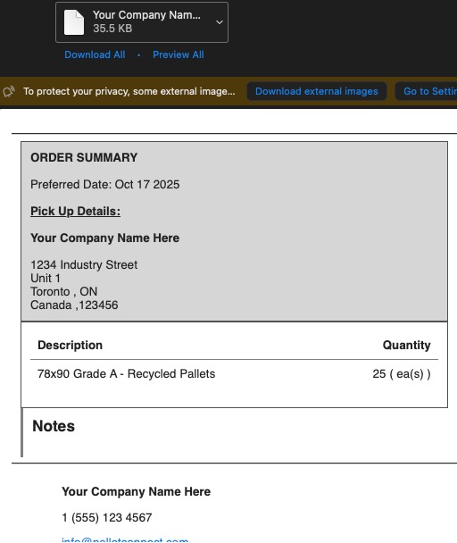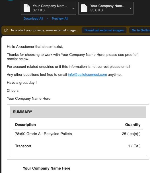 12. The Customer will receive an email titled. "Your Invoice (reference number and company name is included)". A PDF copy of the Invoice (with pricing) and the Proof Of Pick Up is attached.