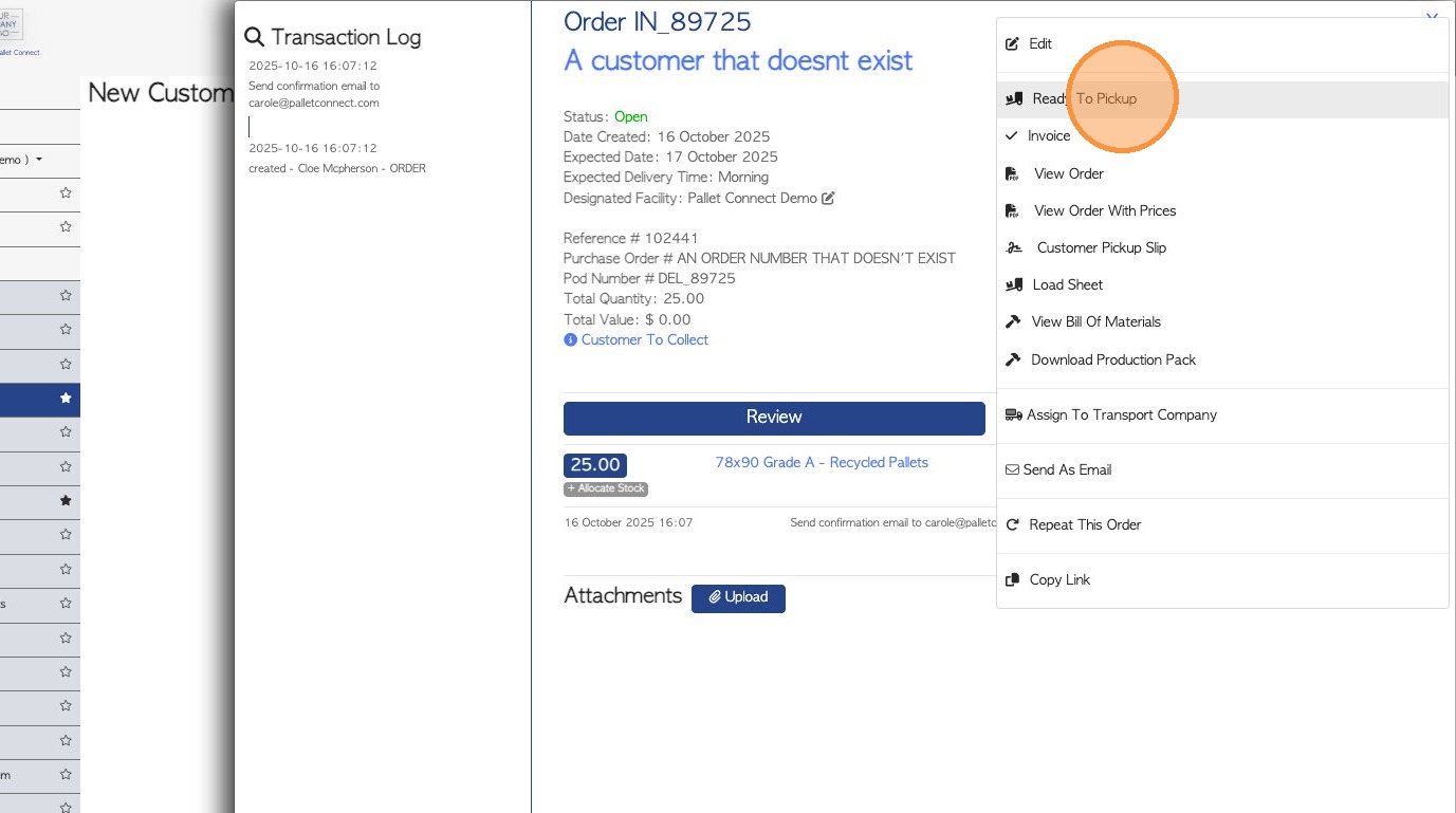 When the order is ready for collection, click "Ready To Pickup" in the transaction menu.