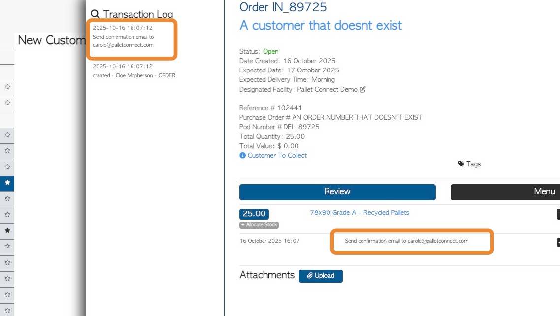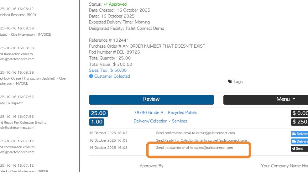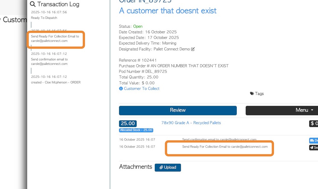 8. In the transaction logs, the email is shown as "Send Ready For Collection Email"