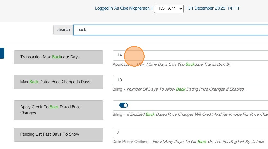 6. Look for "Transaction Max Backdate Days". Click on this number field to change the number of days the system is allowed to backdate.