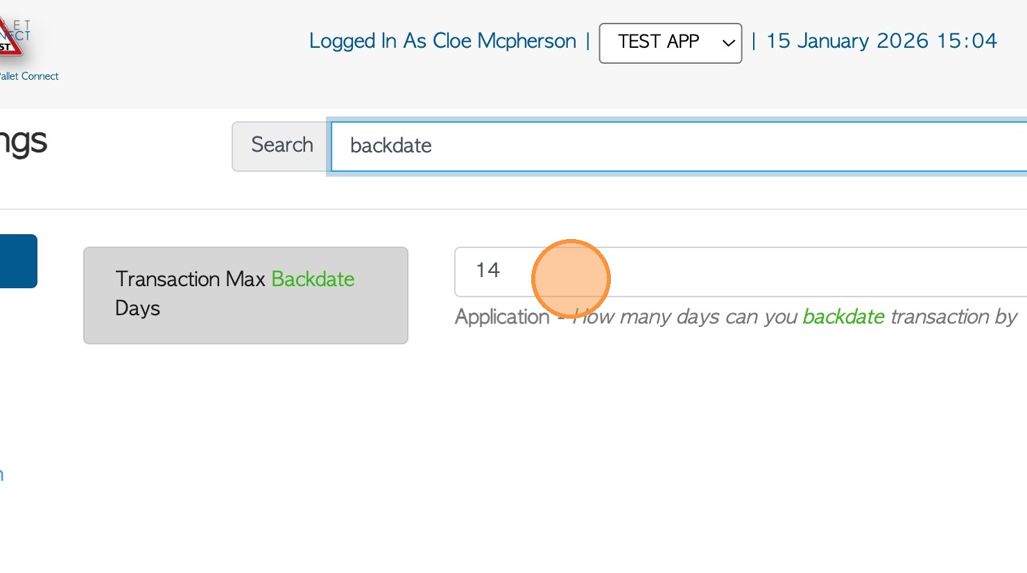 "Transaction Max Backdate Days" is a system-wide setting in Pallet Connect that controls how far back users can date transactions. This setting allows administrators to define the maximum number of days an entry can be backdated, helping ensure accurate record-keeping, while maintaining appropriate flexibility for operational needs.