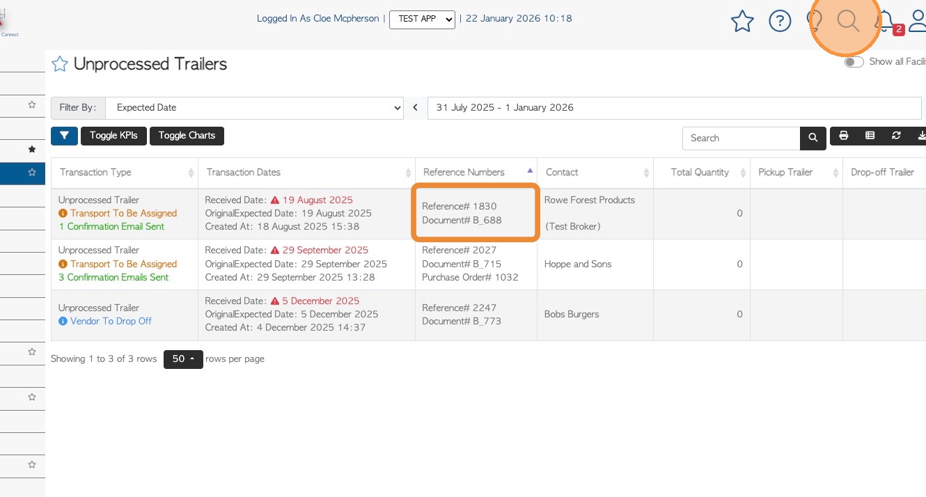 To open the Unprocessed Trailer details, enter the reference number into the global search (located at the top right of each corner).