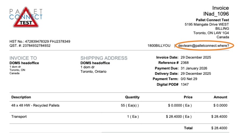 4. Below are examples of how the email address will appear on a document sent from Pallet Connect: