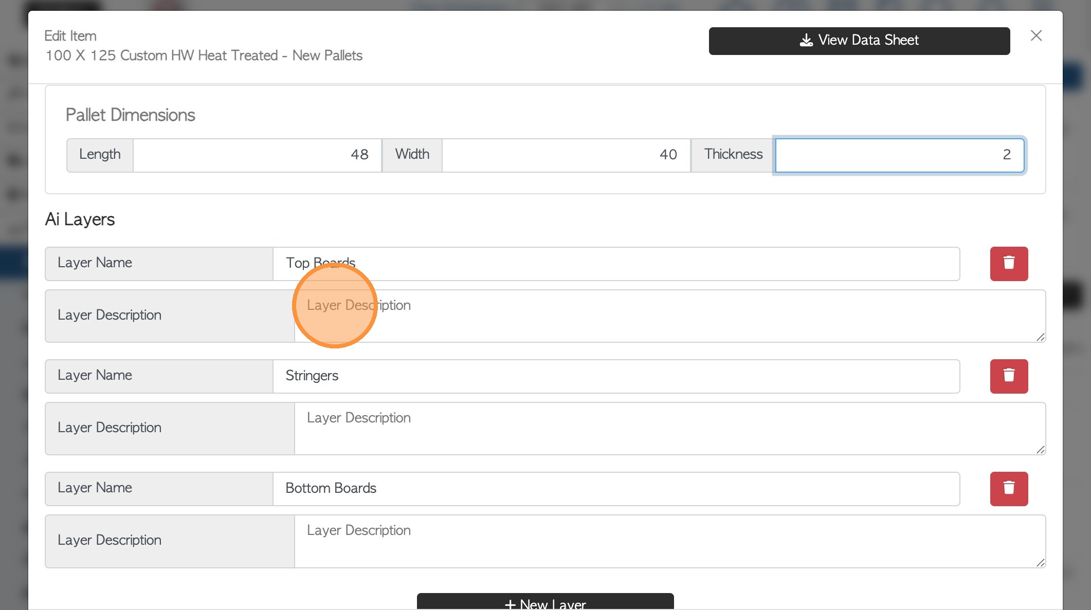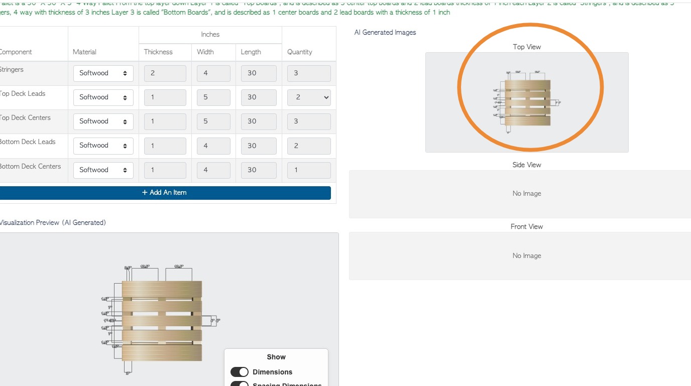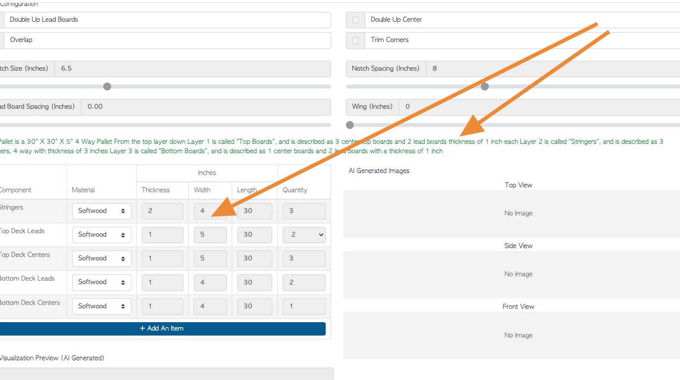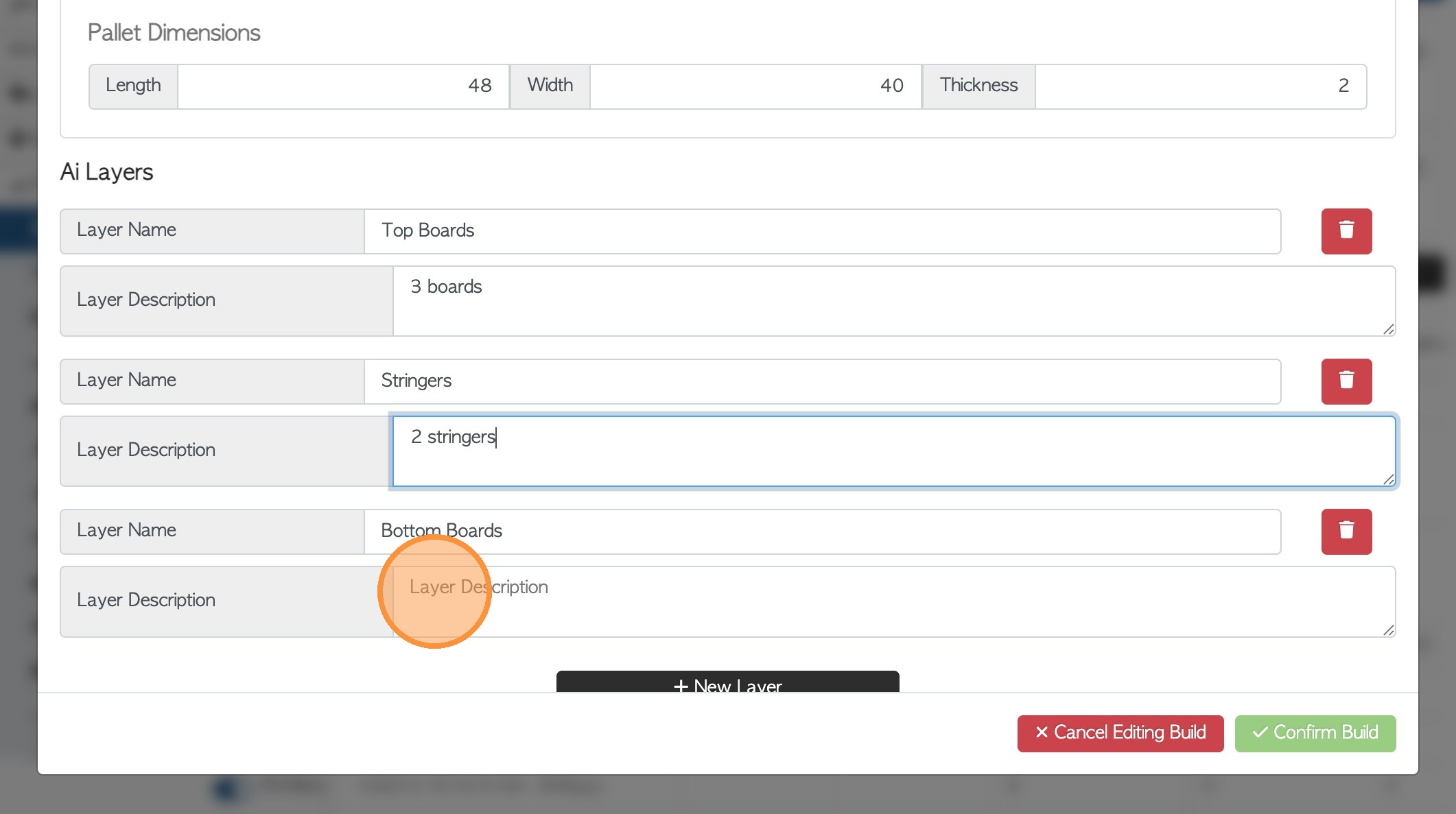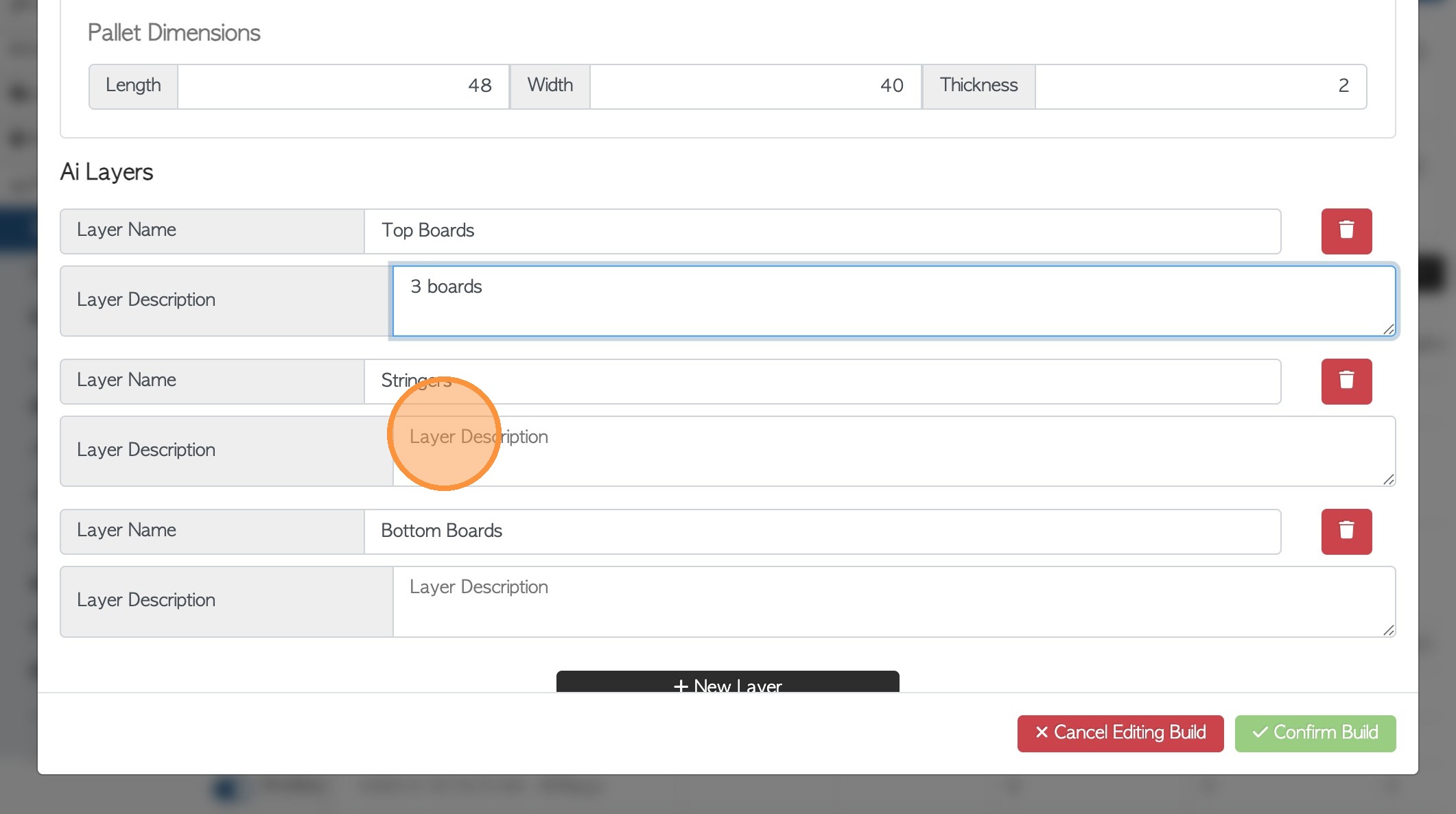 Learn how to enable the AI pallet builder and define custom specifications for new pallet designs. This guide walks through the step-by-step process of inputting dimensions and layer details to generate accurate production drawings.