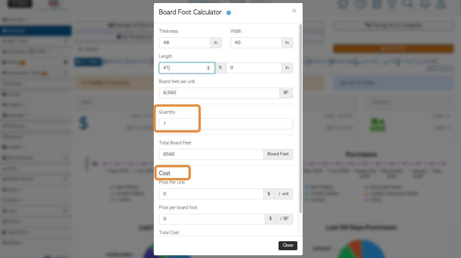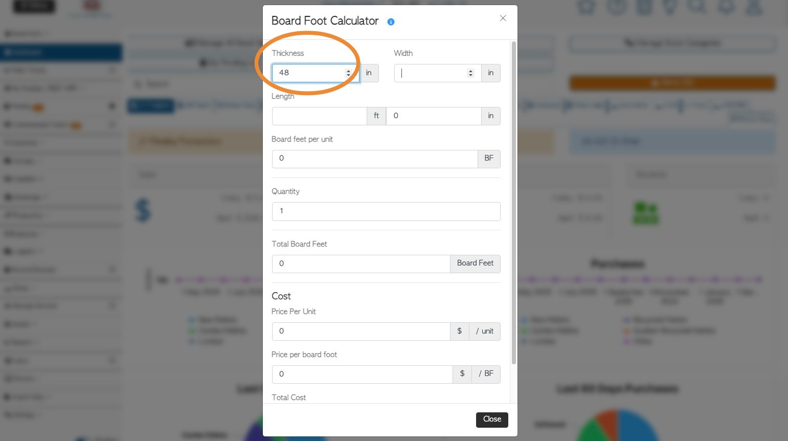 1. The Board Foot Calculator in Pallet Connect is designed to give users a fast and reliable way to calculate board feet based on key dimensions. Instead of manually applying formulas or switching between tools, users can enter thickness, width and length to instantly determine board feet per unit.