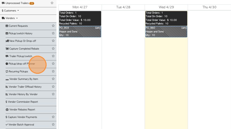 7. FROM PICK UP PLANNER: Click "Vendors" from the main menu.