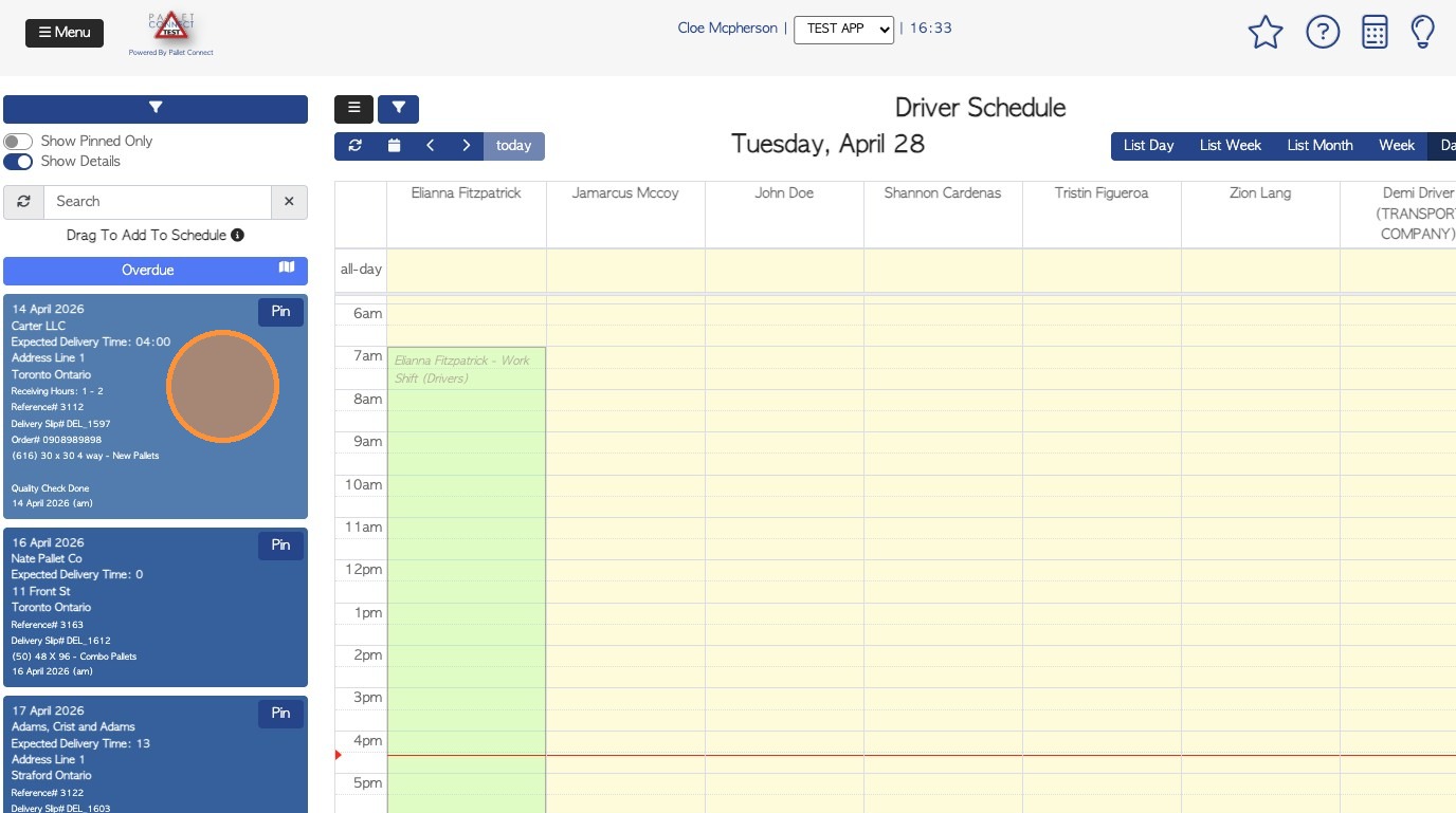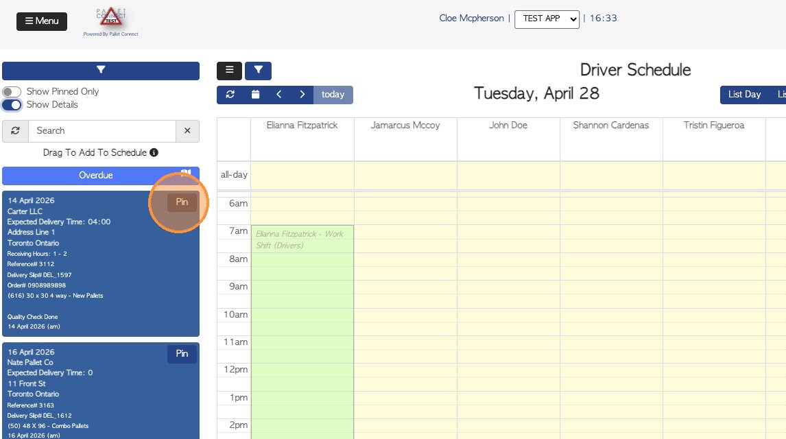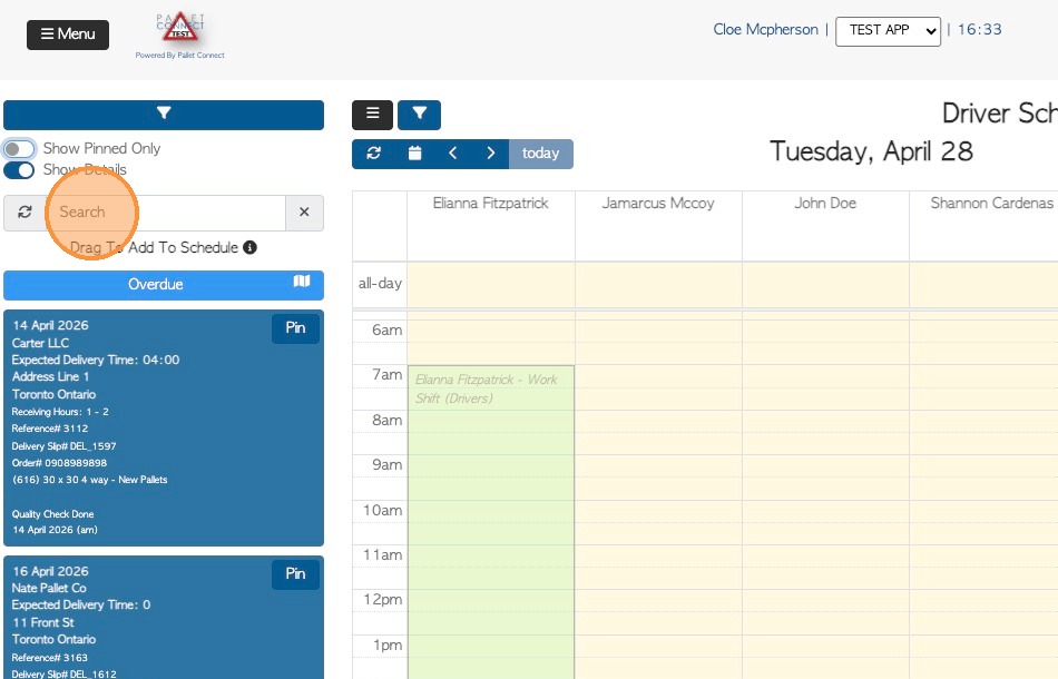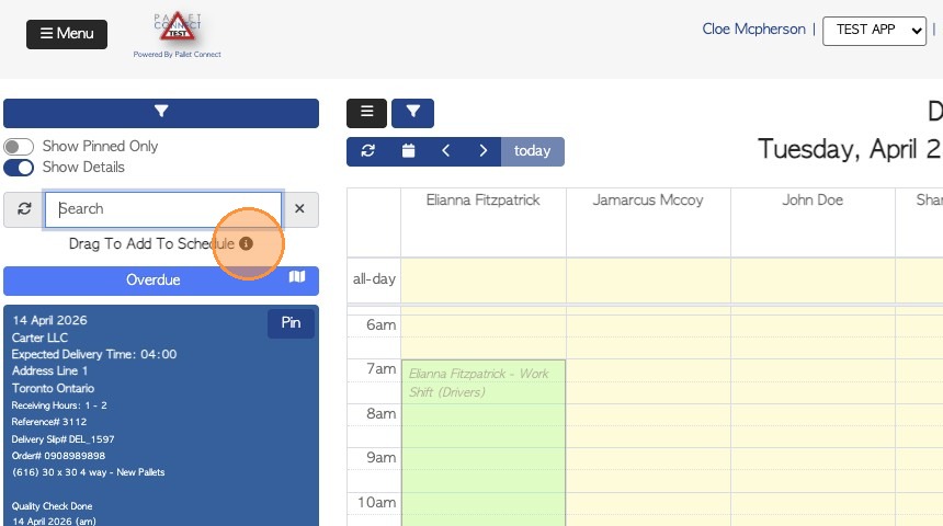 15. To schedule a pick up or delivery, select one from the list and drag and drop onto the calendar, under the appropriate driver's name, at the relevant time.