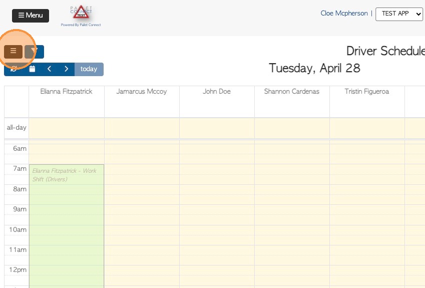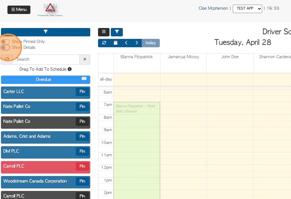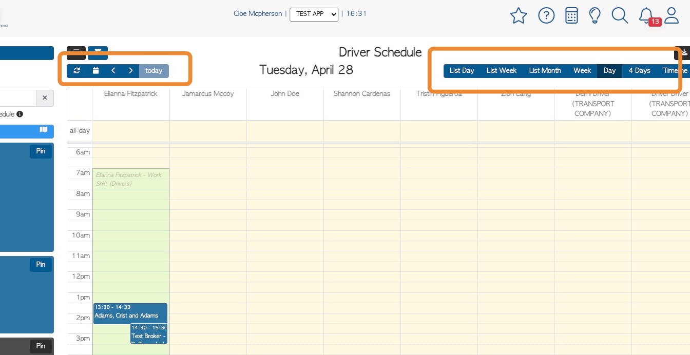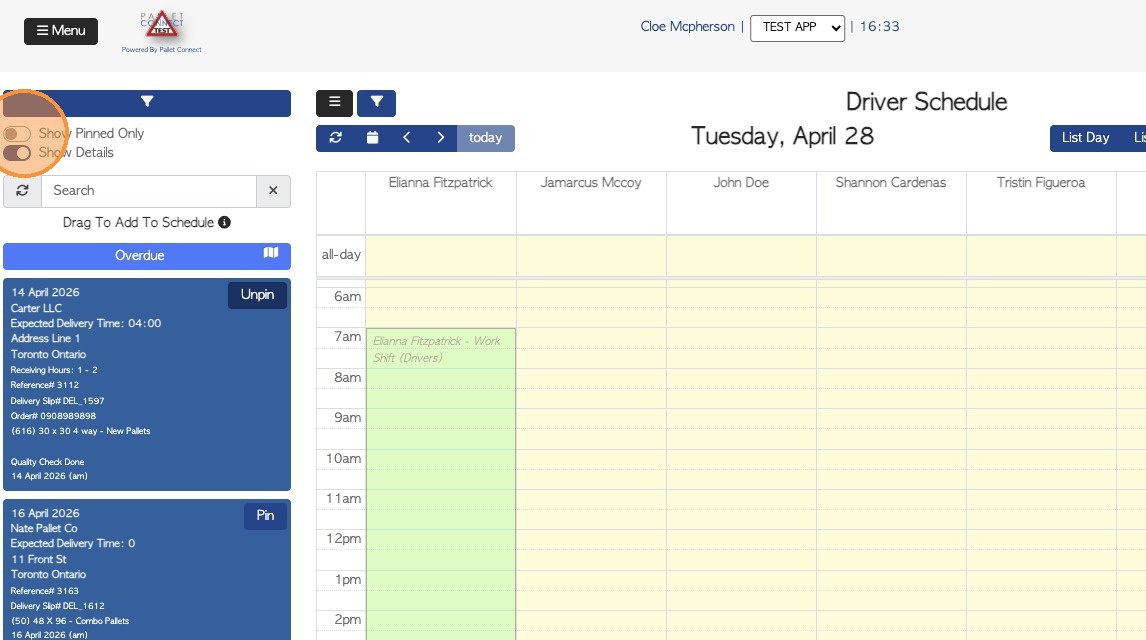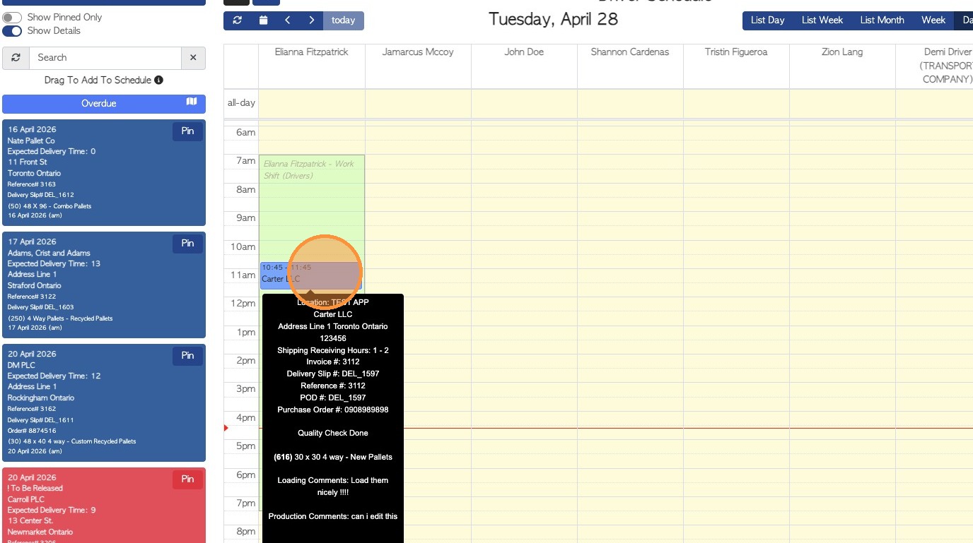 15. To schedule a pick up or delivery, select one from the list and drag and drop onto the calendar, under the appropriate driver's name, at the relevant time.