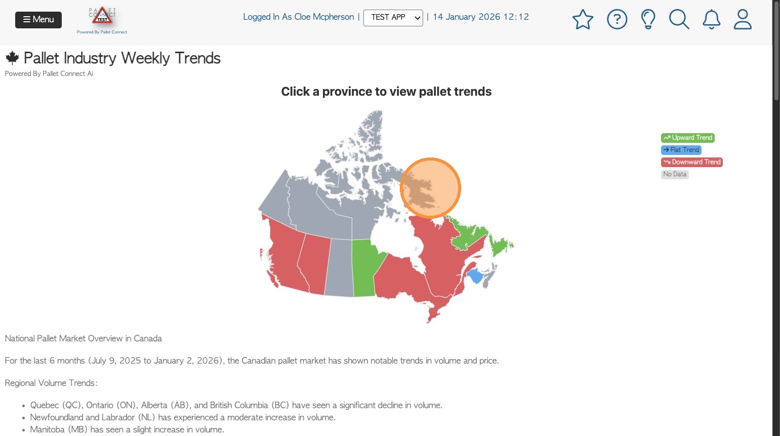 Users can view an interactive provincial/state map that highlights regional market direction, upward, flat or downward, allowing for quick comparison between provinces.