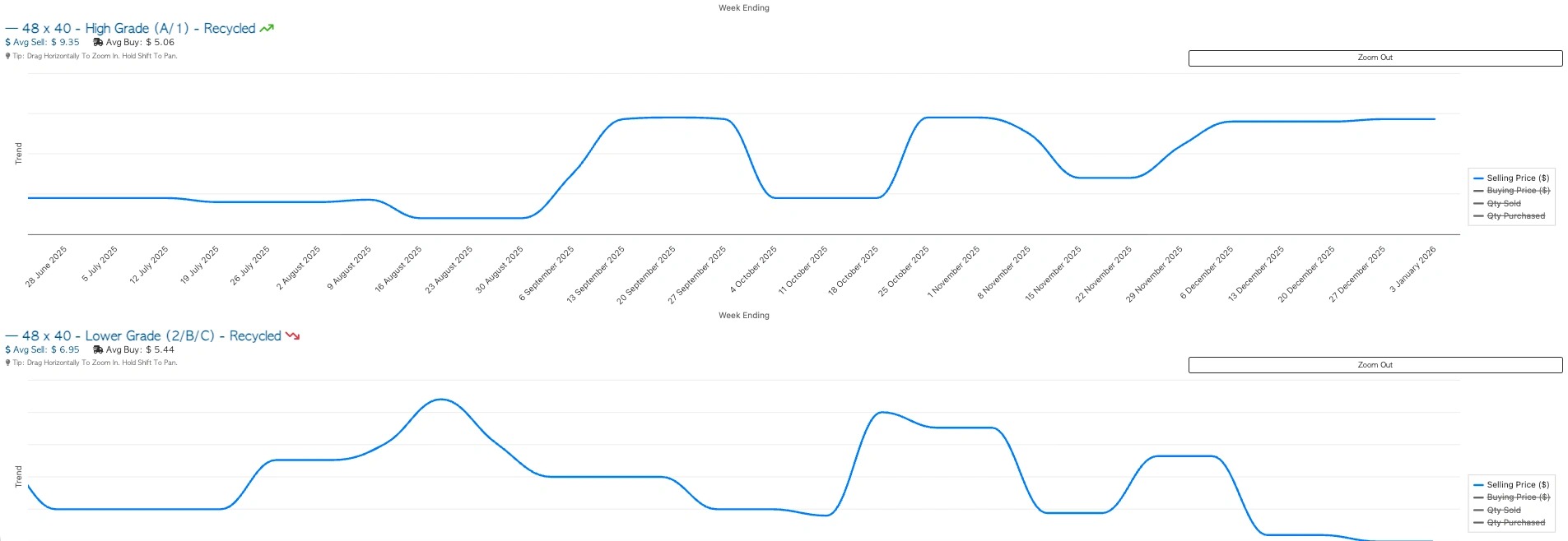 The page displays interactive line graphs that illustrate week-over-week trends across the market. These graphs track both selling prices and buying prices, broken down by pallet type, making it easy to compare performance over time. Users can hover their cursor over the graphs to view detailed data points for specific weeks and use the mouse scroll to zoom in or out, allowing for closer analysis of short-term fluctuations or broader long-term trends.