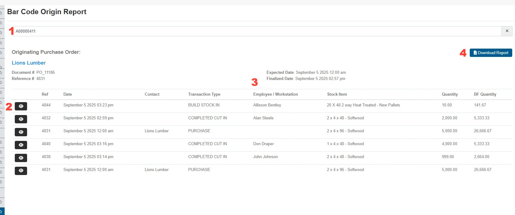 The report will show all the history of the barcode from purchasing to building a pallet. Below is a screenshot of an example where user can track where the lumber came from.