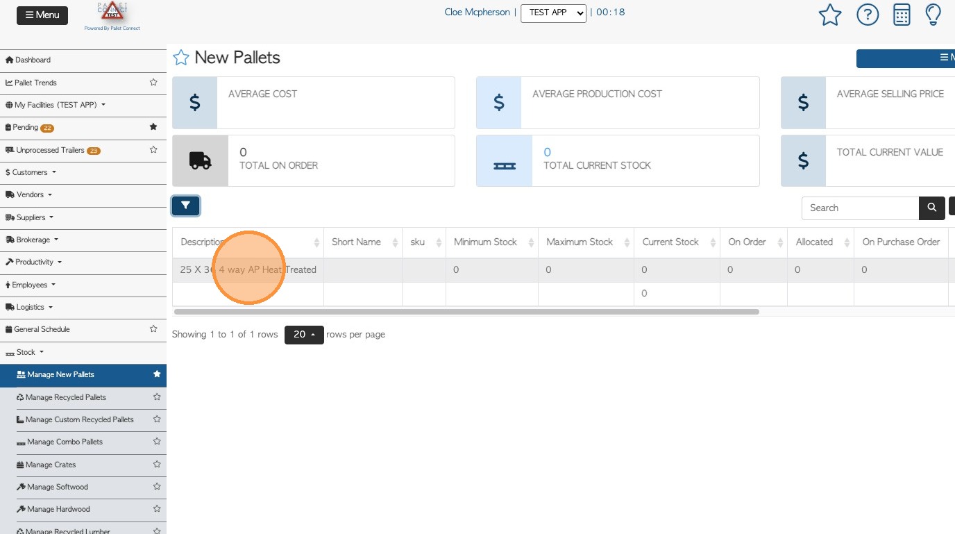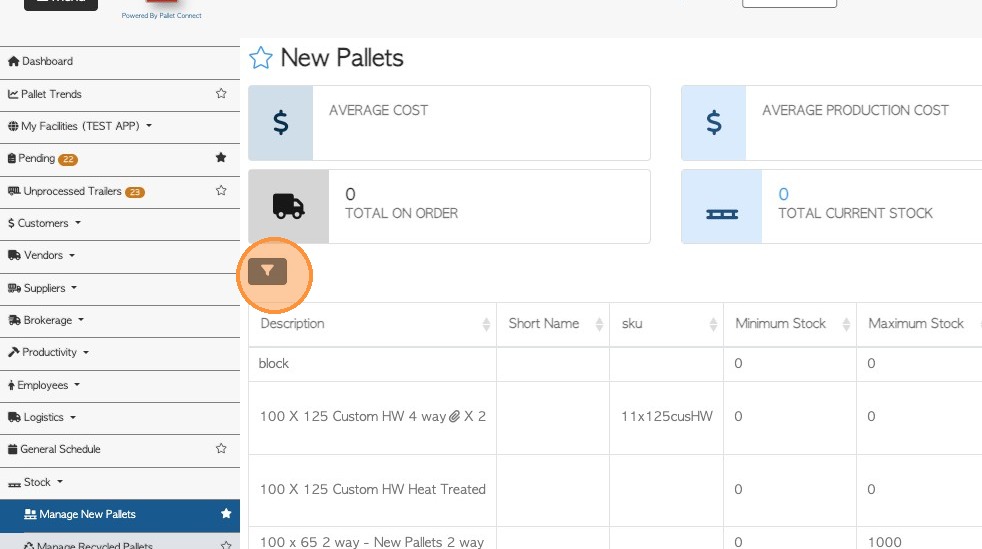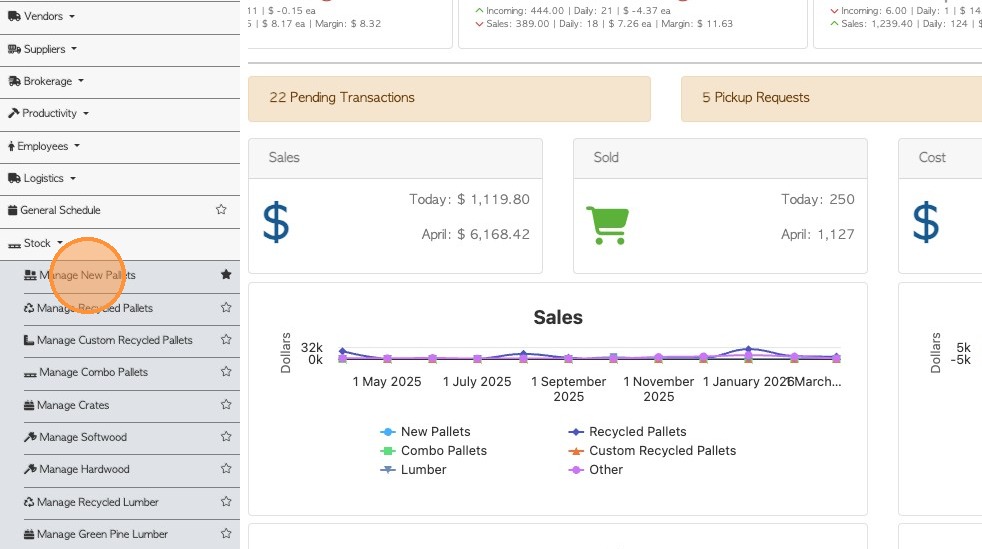 2. To start, go to Stock section of the Main Menu. Then to 'Manage New Pallets' or any stock item category that is listed. For this example, the article will focus on deactivating a New Pallet.