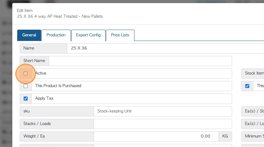 4. In the General tab, look for the "Active" checkbox. To deactivate the item, de-select the check box.