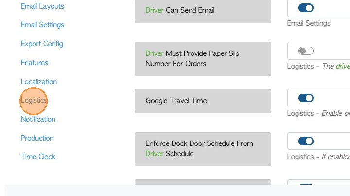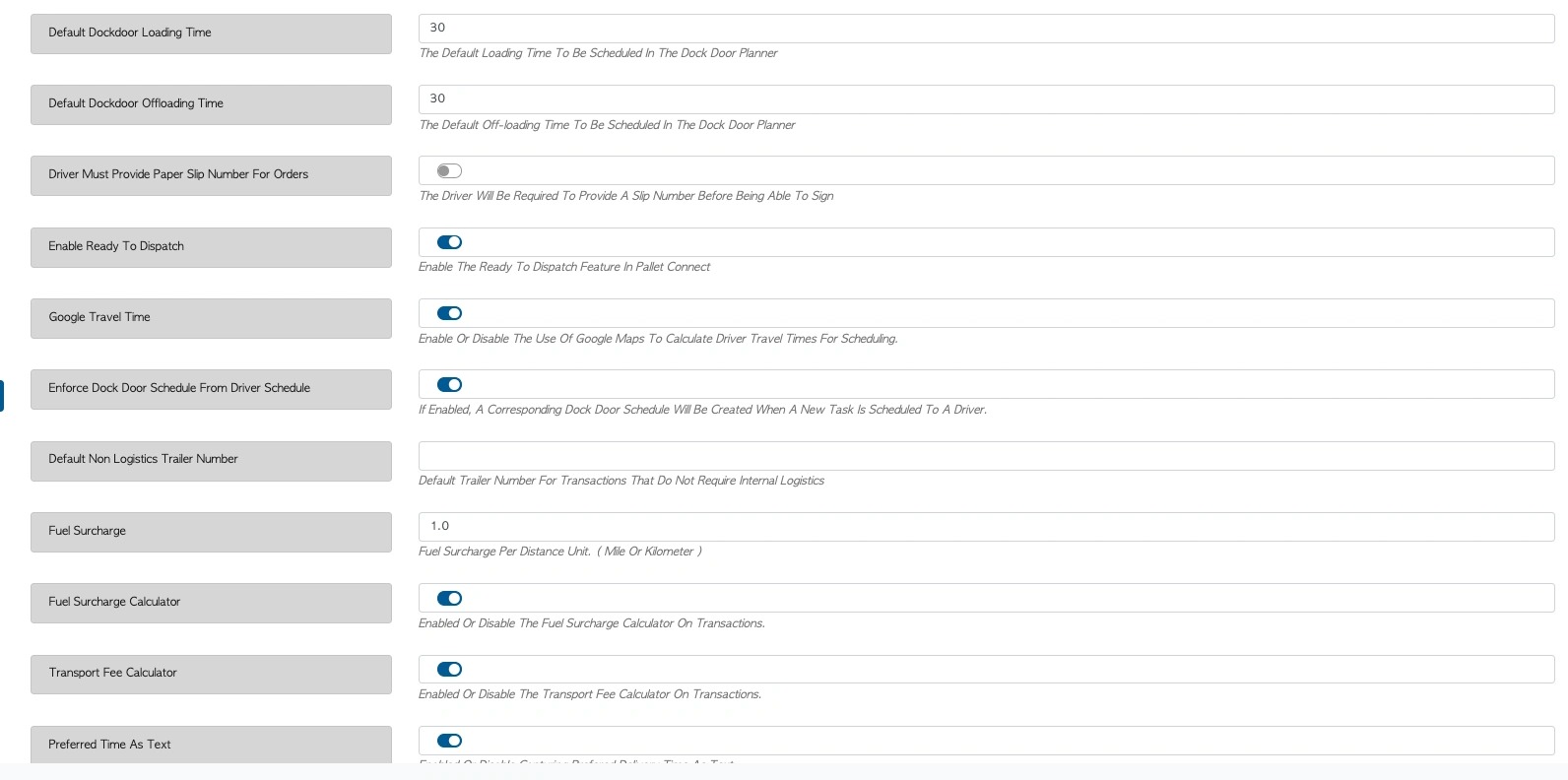 1. The Logistics system settings allow administrators to configure how scheduling, driver tasks, and cost calculations behave across the platform. These settings help plan logistics in advance, define what information drivers must capture and control how the planner and dock door modules operate.